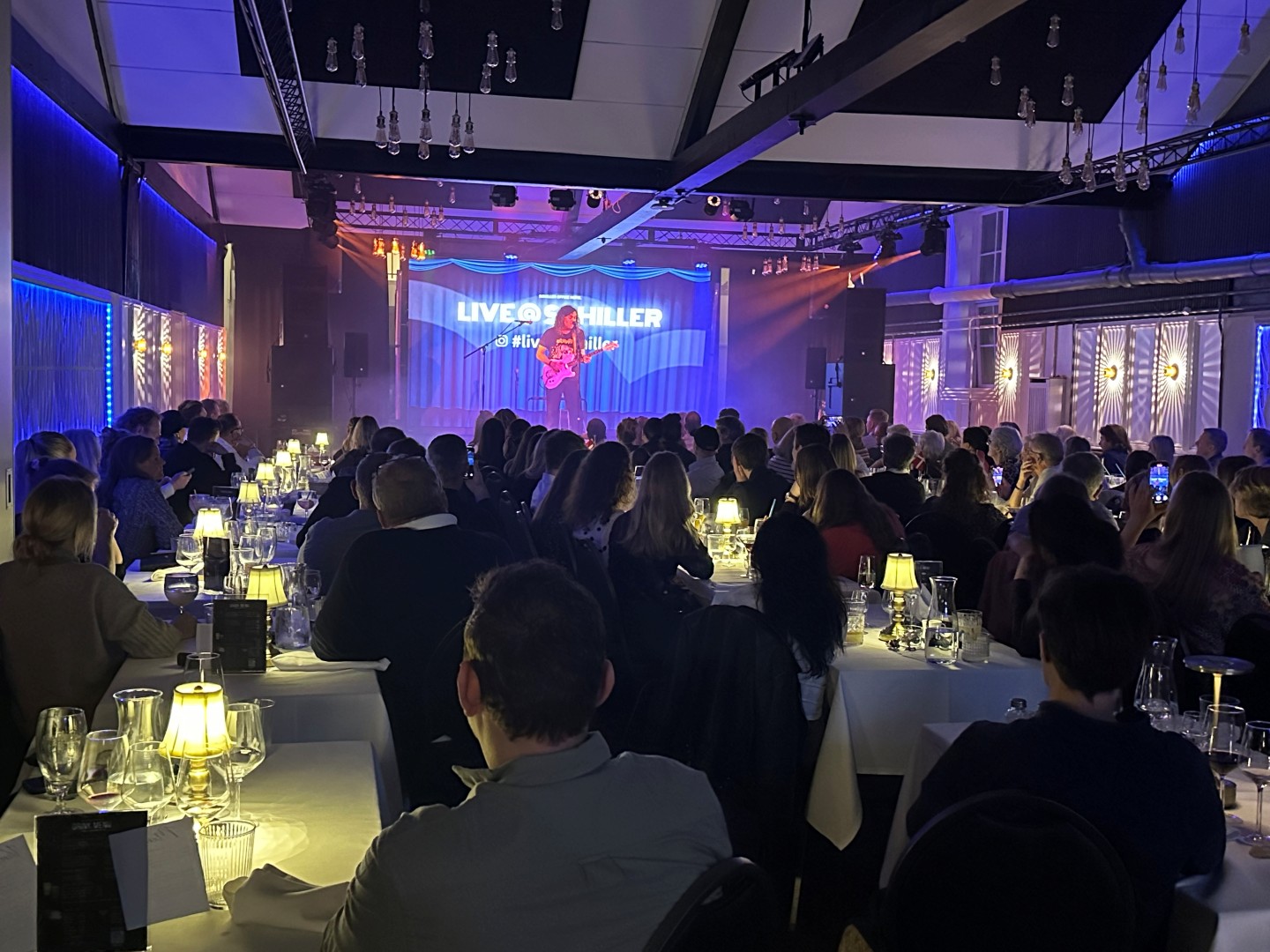 Schillers køkken serverer en lækker hjemmelavet 2 retters middag med højt niveau (tapas/charcuterie/oste samt hjemmebagt brød og tiramisu til dessert). Koncerten opleves siddende fra bordene og opdelt så man kun sidder ved bord med sine venner, famile og kollegaer.