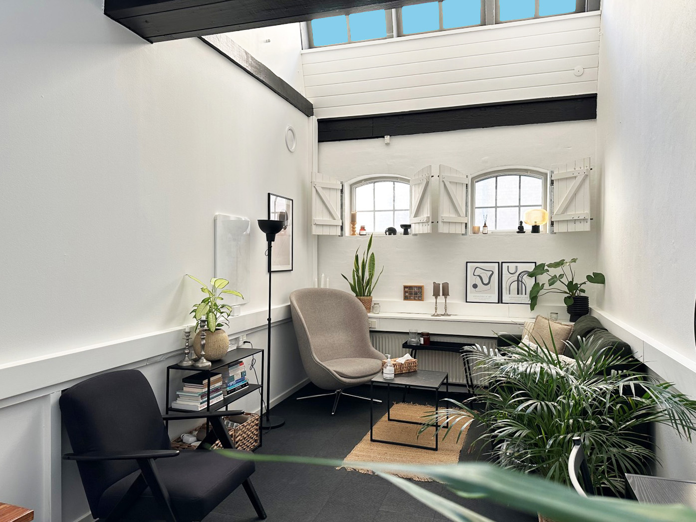 Lyst kontor for 3-5 personer med højt til loftet i kontorbygningen "Stalden".